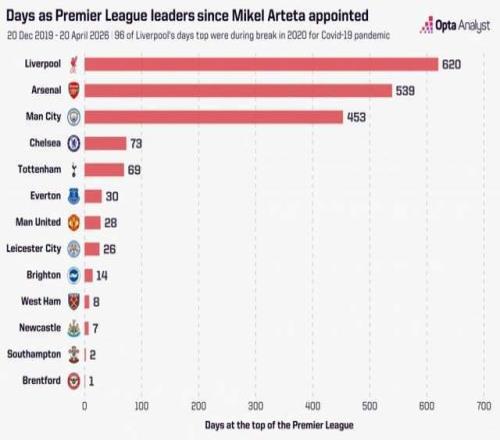 自2019年12月上任以來,阿爾特塔麾下的阿森納在英超榜首的天數(shù)為539天,僅次于620天的利物浦。不過,利物浦在積分榜上領(lǐng)跑的天數(shù)包含了2020年因疫情導(dǎo)致聯(lián)賽停擺的接近100天。