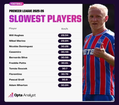 體育播報4月23日宣 數(shù)據(jù)機(jī)構(gòu)OPTA統(tǒng)計了本賽季速度最慢的英超球員,梅里諾、卡塞米羅、B席列前五。