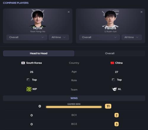 體育播報4月22日宣 在今日的LPL第二賽段比賽上,NIP以0-2的比分不敵AL,而上單選手HOYA職業(yè)生涯面對Flandre小局勝率依舊為零,雙方一共交手13個小局,HOYA一勝難求!