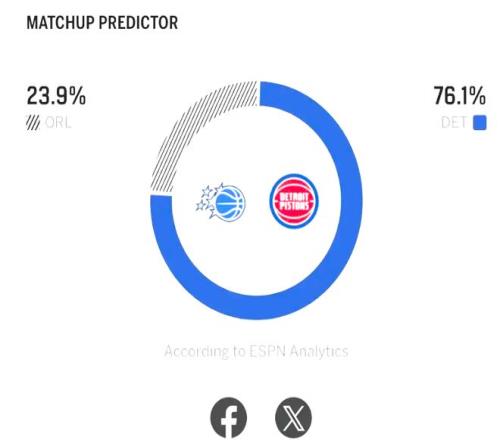 而G1戰(zhàn)中,活塞除了坎安寧拿到39分,末節(jié)獨砍16分,但依舊難以帶隊贏球,活塞某種意義上就是火箭的翻版,缺少進攻能力,得分點太少!杜倫在內線未能打出統(tǒng)治力,球隊得分第二高的哈里斯效率很低,全場15中5。盡管賬面整體實力,活塞占據優(yōu)勢,不過他們想要扭轉局面,球隊不僅需要拿出常規(guī)賽聯(lián)盟第二的防守效率,還需要杜倫在進攻端承擔更多的終結任務。ESPN賽前預測本場比賽的結果:活塞G2取勝概率高達76.1,魔術取勝概率低至23.9%。
