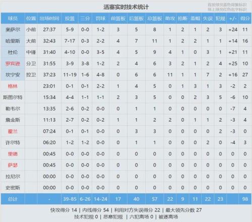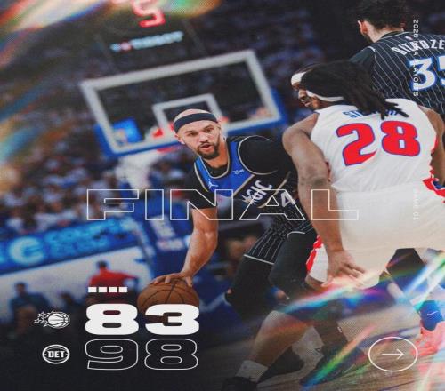 活塞第三節(jié)38-16單節(jié)凈勝22分,三節(jié)打完,活塞84-62領(lǐng)先魔術(shù)22分。第四節(jié)早已沒有懸念,雙方遲遲沒換下首發(fā),最后45秒坎寧安和杜倫才下場?;钊漭?shù)鬐1之后,今天不容有失。全場結(jié)束,活塞98-83大勝魔術(shù),1比1平!