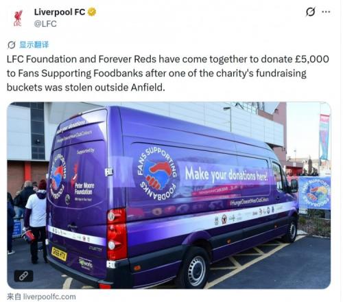 “球迷支持食物銀行”組織在安菲爾德球場外的一個(gè)募捐箱被盜,利物浦基金會和“永恒紅軍”向該慈善組織捐贈5000英鎊,以彌補(bǔ)損失。