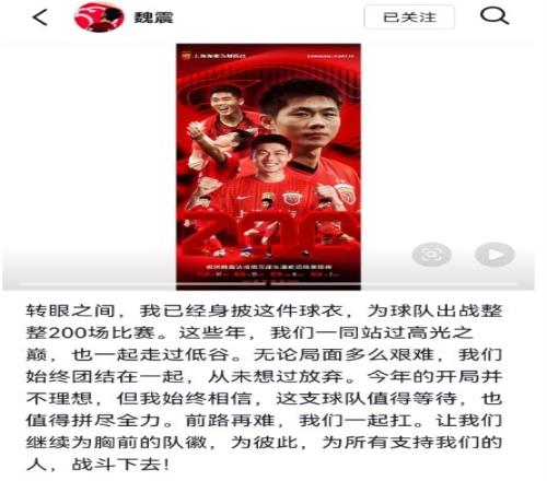 體育播報4月23日宣 中超聯(lián)賽第七輪,上海海港主場1-2不敵重慶銅梁龍。本場比賽,魏震首發(fā)出場,達成其個人代表海港隊出戰(zhàn)各項賽事的二百場里程碑。賽后,魏震更新了個人社交媒體。