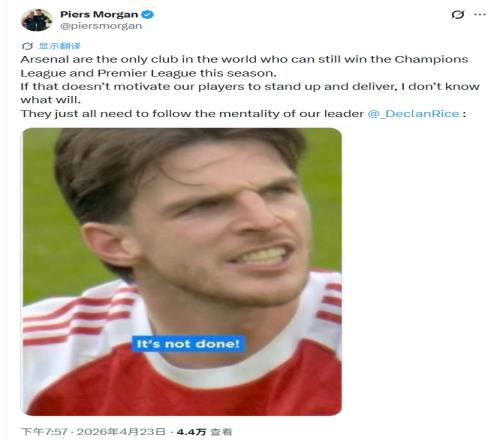 摩根在社媒寫道:阿森納是本賽季世界上唯一一支仍有可能同時贏得歐冠和英超的俱樂部。如果這都不能激勵我們的球員挺身而出、拿出表現(xiàn),那我不知道還有什么能了。他們只需要追隨我們領(lǐng)袖的心態(tài)。@賴斯