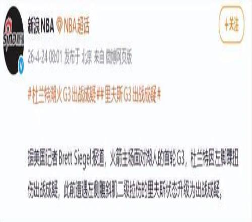 更嚴(yán)峻的是,火箭隊官方于4月23日更新傷情報告:杜蘭特除原有膝傷外,新增左腳踝扭傷,G3出戰(zhàn)狀態(tài)為“出戰(zhàn)成疑”。這意味著他能否登場,將在賽前熱身結(jié)束后才最終決定。