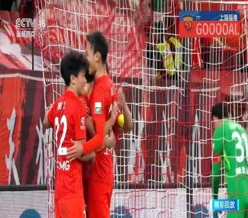 第77分鐘,劉祝潤(rùn)小角度推射破門,海港4-0領(lǐng)先,劉祝潤(rùn)貢獻(xiàn)一傳一射。