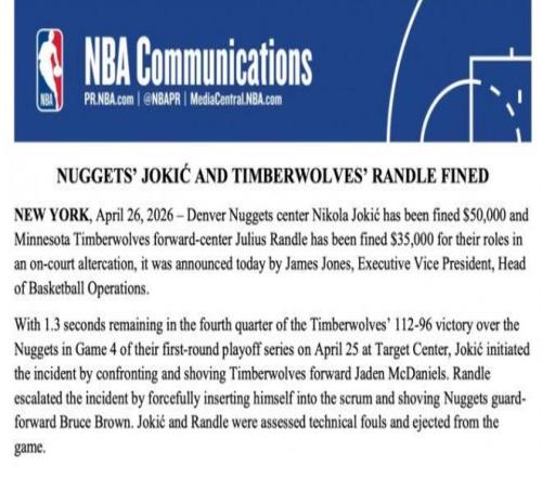 北京時間4月27日,NBA官方公布對于首輪G4掘金與森林狼沖突的處罰結(jié)果,約基奇被罰款5萬美元,蘭德爾被罰款3.5萬美元,而麥克丹尼爾斯沒有被處罰,雙方?jīng)]有球員被禁賽成為萬幸之事。