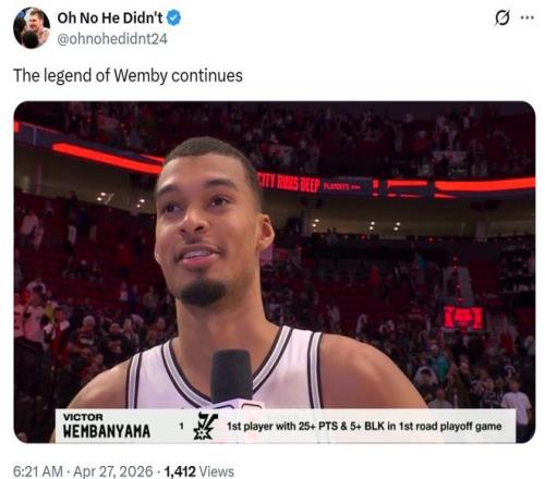 在G2遭遇腦震蕩傷退后,僅缺席G3一場比賽后,文班在本場G4火線復(fù)出,并且再度創(chuàng)造NBA歷史紀錄。