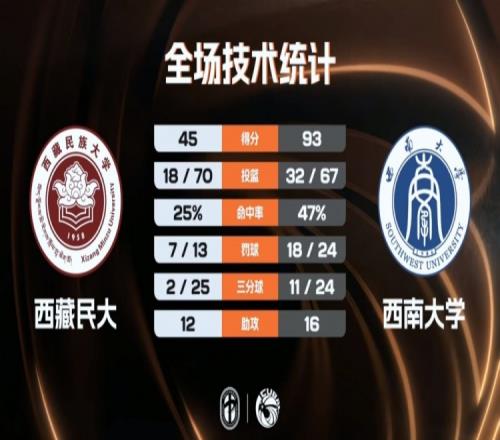 末節(jié)比賽,西藏民大還是慢熱,西南大學(xué)再拿6分繼續(xù)擴(kuò)大領(lǐng)先優(yōu)勢,之后的比賽分差一直保持在三十分以上并在節(jié)末達(dá)到40+,比賽早早就失去懸念,最終西南大學(xué)93-45大勝西藏民大。