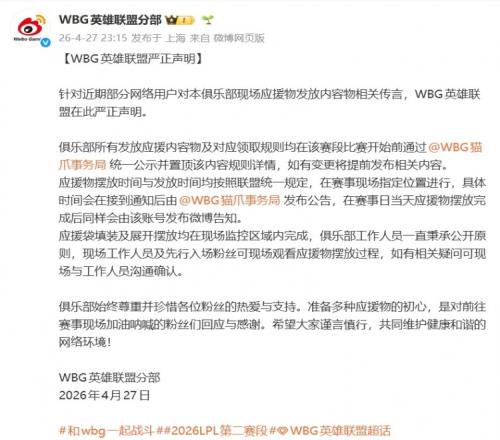 針對(duì)近期部分網(wǎng)絡(luò)用戶對(duì)本俱樂(lè)部現(xiàn)場(chǎng)應(yīng)援物發(fā)放內(nèi)容物相關(guān)傳言,WBG英雄聯(lián)盟在此嚴(yán)正聲明。