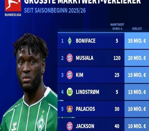 北京時(shí)間4月7日,德轉(zhuǎn)列出了2025-26賽季德甲球員的身價(jià)降幅榜,去年夏天從勒沃庫森租借加盟云達(dá)不萊梅的博尼費(fèi)斯因飽受傷病困擾身價(jià)暴跌3500萬歐元排名第一,穆西亞拉下跌2000萬