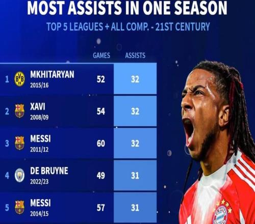 本世紀(jì)五大聯(lián)賽球員單賽季助攻前10:姆希塔良第1,奧利塞第7