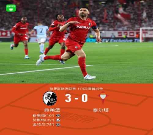 北京時(shí)間4月10日歐足聯(lián)歐洲聯(lián)賽 1/4決賽首回合,弗賴堡對(duì)陣塞爾塔。弗賴堡格里福破門,貝斯特破門,金特爾破門。最終比分弗賴堡 3-0 塞爾塔。關(guān)鍵事件第10分鐘,曼贊比橫傳,格里福兜